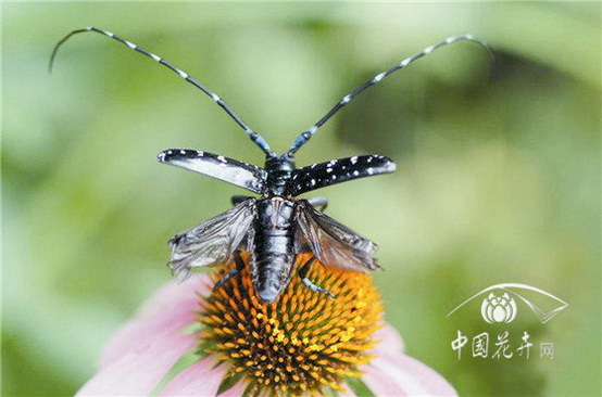 成虫身漆黑,扁平紫铜光。触角比身长,十二节鞭状。各有一刺突,前胸两侧旁。鞘翅上绒斑,白色不同样。